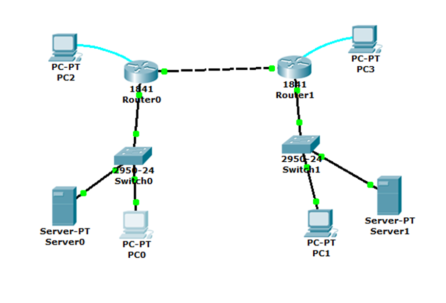 Como podemos ver, es el mismo modelo de red que hemos estado usando pero como vera hemos agregado dos servidores, asi que en este post veremos como configurar un servidor en el simulador.