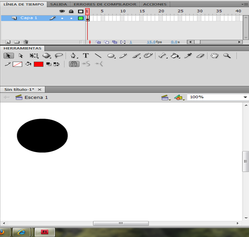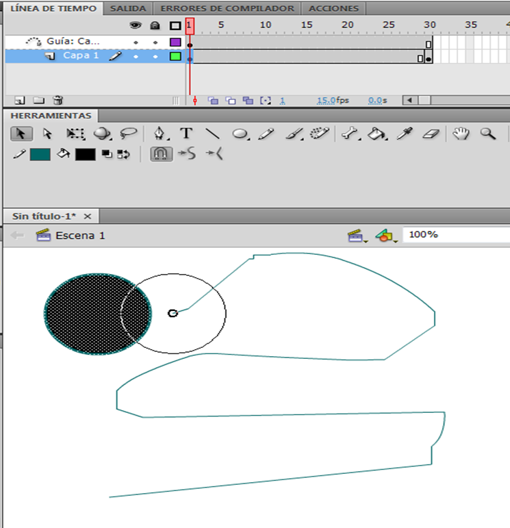 Las guias de movimiento nos permitiran dibujar una linea sobre la cual se mover el objeto, comencemos con lo basico de todos los ejemplos un fotograma clave y una figura, en este caso un circulo