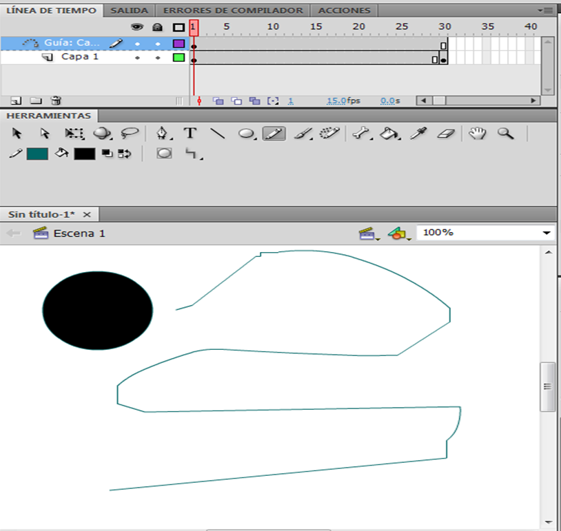 Para dibujar la linea de guia nos moveremos al fotograma 1 de la capa de guia y usaremos la herramienta de lapiz para dibujar la linea