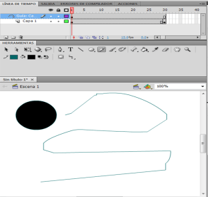 Ahora nos iremos al fotograma 1 de la capa 1 y usando la herramienta de seleccion moveremos el circulo al comienzo de la linea que dibujamos, observe que parece moverse solo el borde, y que aparece un circulo en medio de la figura ese pequeño circulo es el que alinearemos con el comienzo de la linea