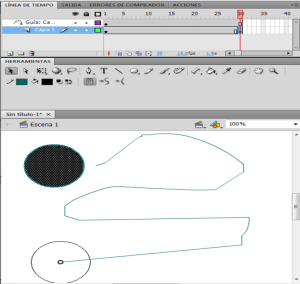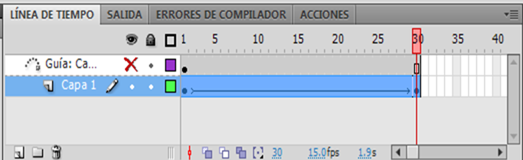 Para evitar que tengamos una animacion de una figura que se mueve sobre una linea, ocultaremos la capa de guia para que la linea no se vea, y solo veamos la figura moviendose, para ello en la columa de visibilidad, la que esta marcada con un ojo, marcaremos con una «X» la capa de guia