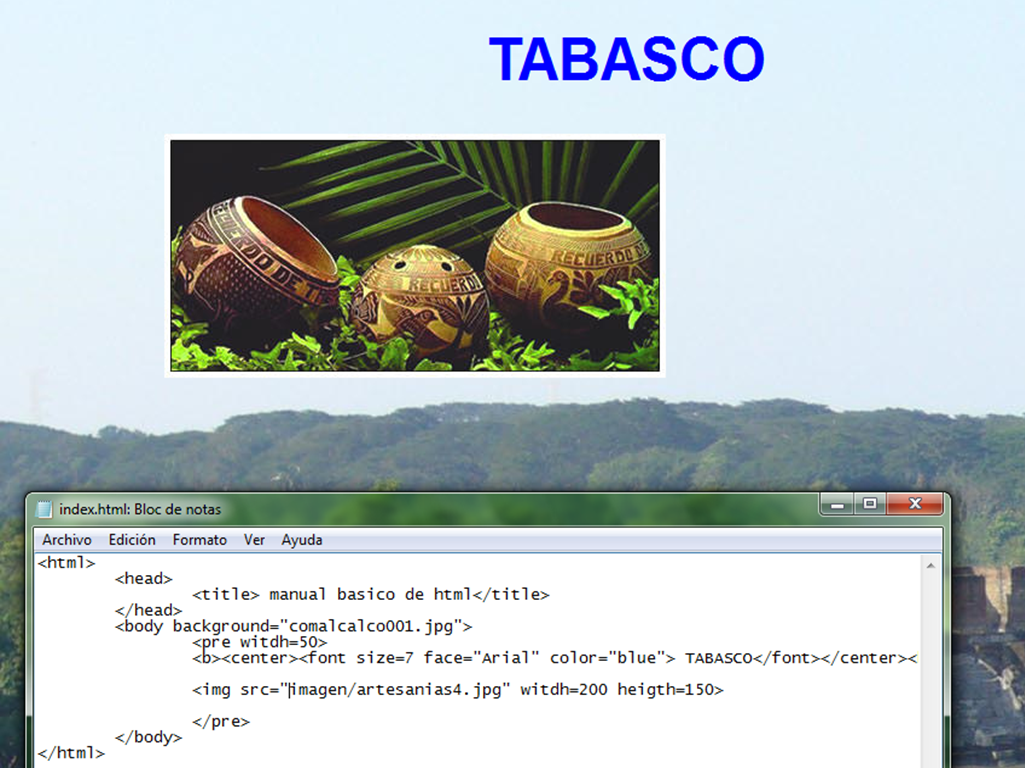 En este punto cabe señalar que la imagen que se esta usando esta en la misma carpeta que el archivo html, si no fuera asi, se deberia incluir la direccion del archivo.