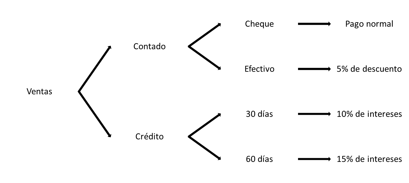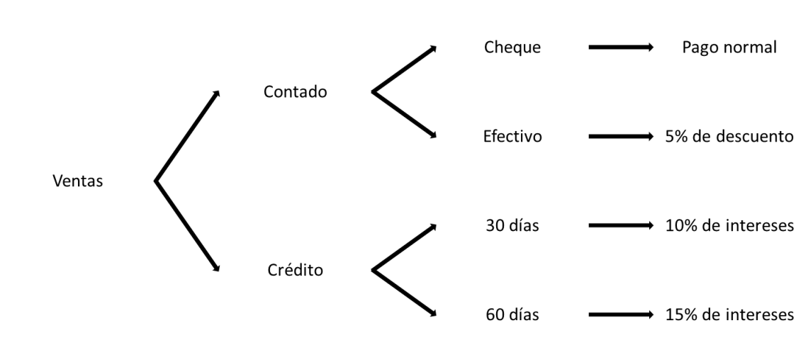 Para su elaboración, comenzamos de izquierda a derecha con el nombre del proceso o decisión, de este sacaremos las lineas hacia la primera etapa de decisión en donde cada rama nos presenta una opción diferente y así de forma subsecuente por cada nodo del árbol, tal y como lo vemos en la imagen siguiente: