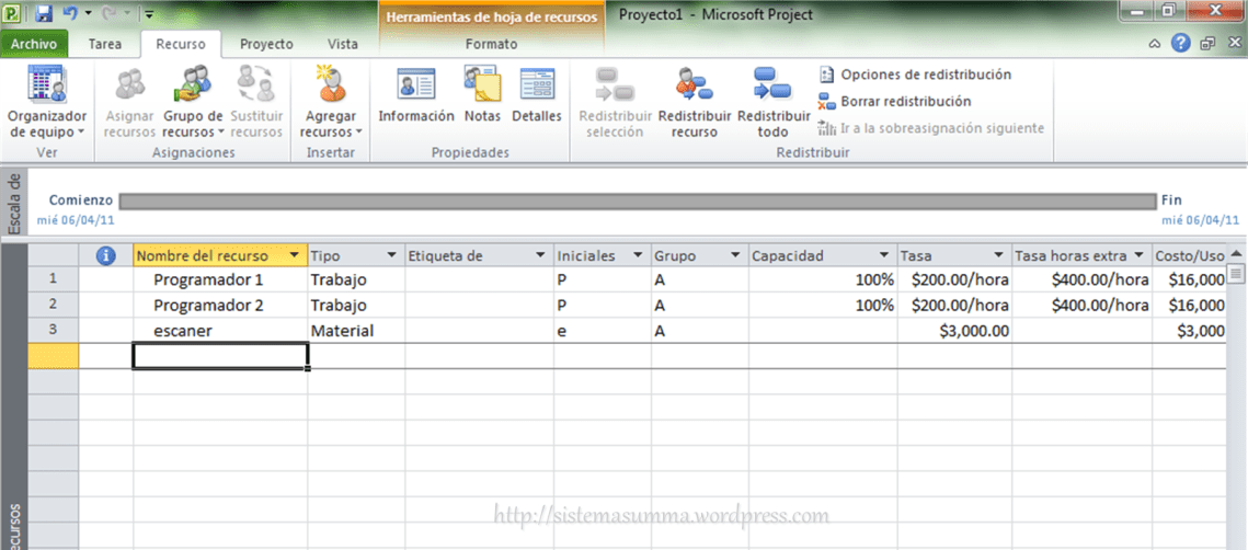 Dentro de Project podemos registrar 3 tipos de recursos: