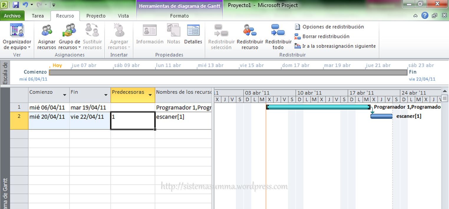 Mientras que si la segunda actividad la asignamos de forma automatica esta se movera para indicar que comenzara al terminar la primera actividad, tal y como lo vemos en la imagen siguiente: