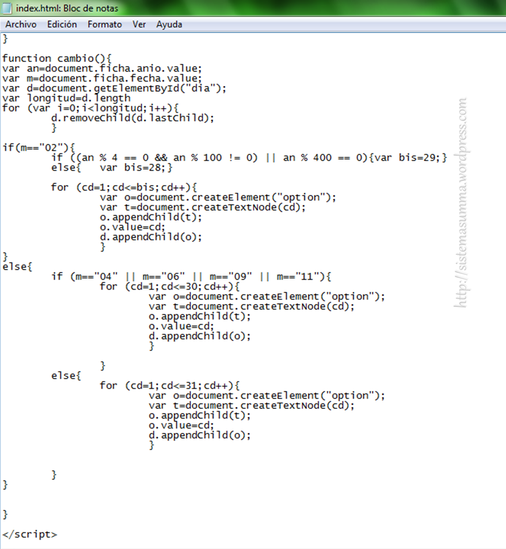 El codigo que agregara los dias se llama a traves del metodo onblur en el select llamado fecha. A continuación presento el codigo que hace esta carga dinamica de los dias del mes y que se ubica en el head de la misma pagina