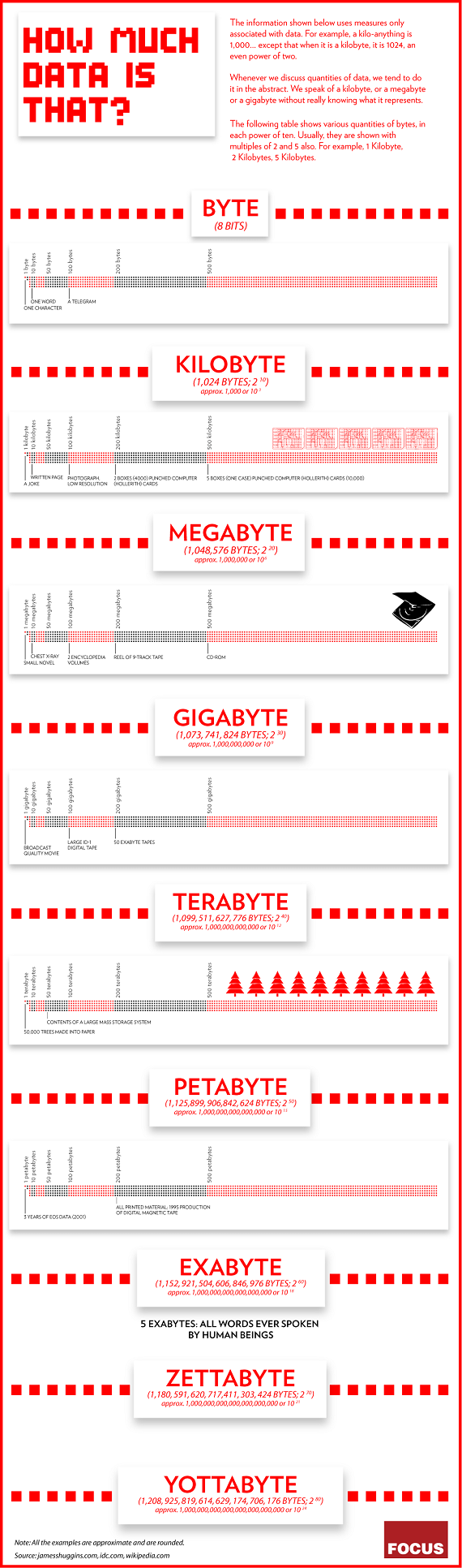 A través de un twit llegué a la pagina de http://www.readwriteweb.es donde presentaban una infografía (imagen que resume un tema) de las equivalencias de los sistemas de almacenamiento, desde un bit hasta un yottabyte (si pensabas que un tera era lo máximo ve la imagen)