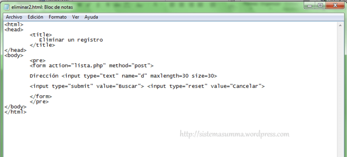 Lo primero que necesitamos es una pagina web que nos solicite el criterio a filtar, la cual sera muy simple, en este caso ocuparemos el campo de dirección para filtrar los datos, quedando el codigo fuente de la siguiente forma