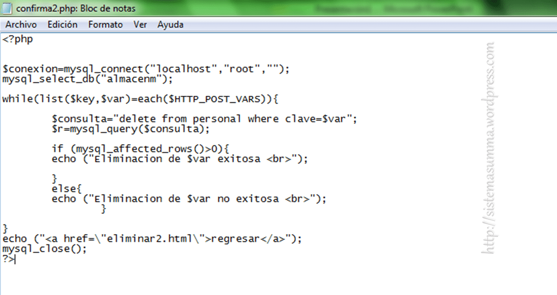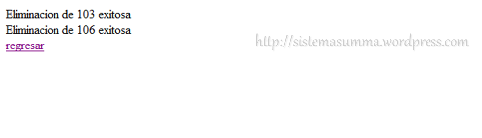 Todo lo anterior se hace para poder mandar a ejecutar por cada valor del arreglo una consulta de eliminación, y cada vez que se ejecuta una consulta de eliminación se presenta un texto informando si la operación tuvo exito o no, y al final de todo se agrega un enlace para retornar quedando la pagina resultante de la siguiente forma