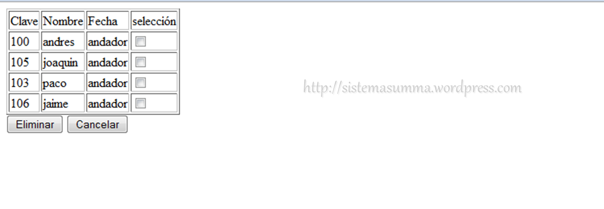 De tal forma que usted podra seleccionar lo registros que se eliminaran, con solo marcar los checkbox que desee, podra eliminar 1, varios o todos los registros presentados.