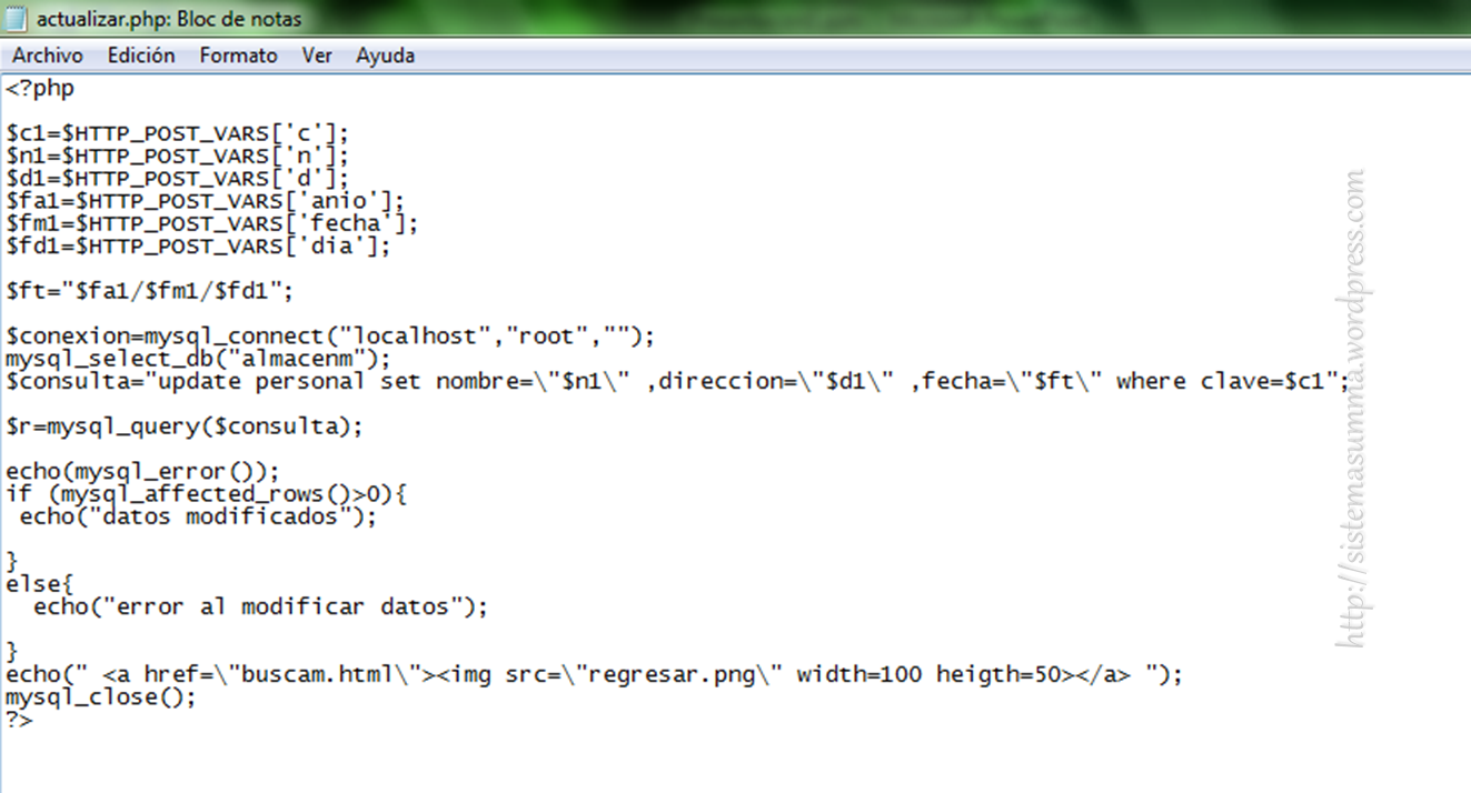La información ya modificada es enviada a actualiza.php, del cual se presenta el código a continuación: