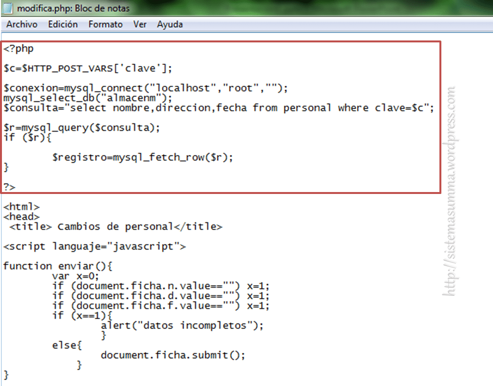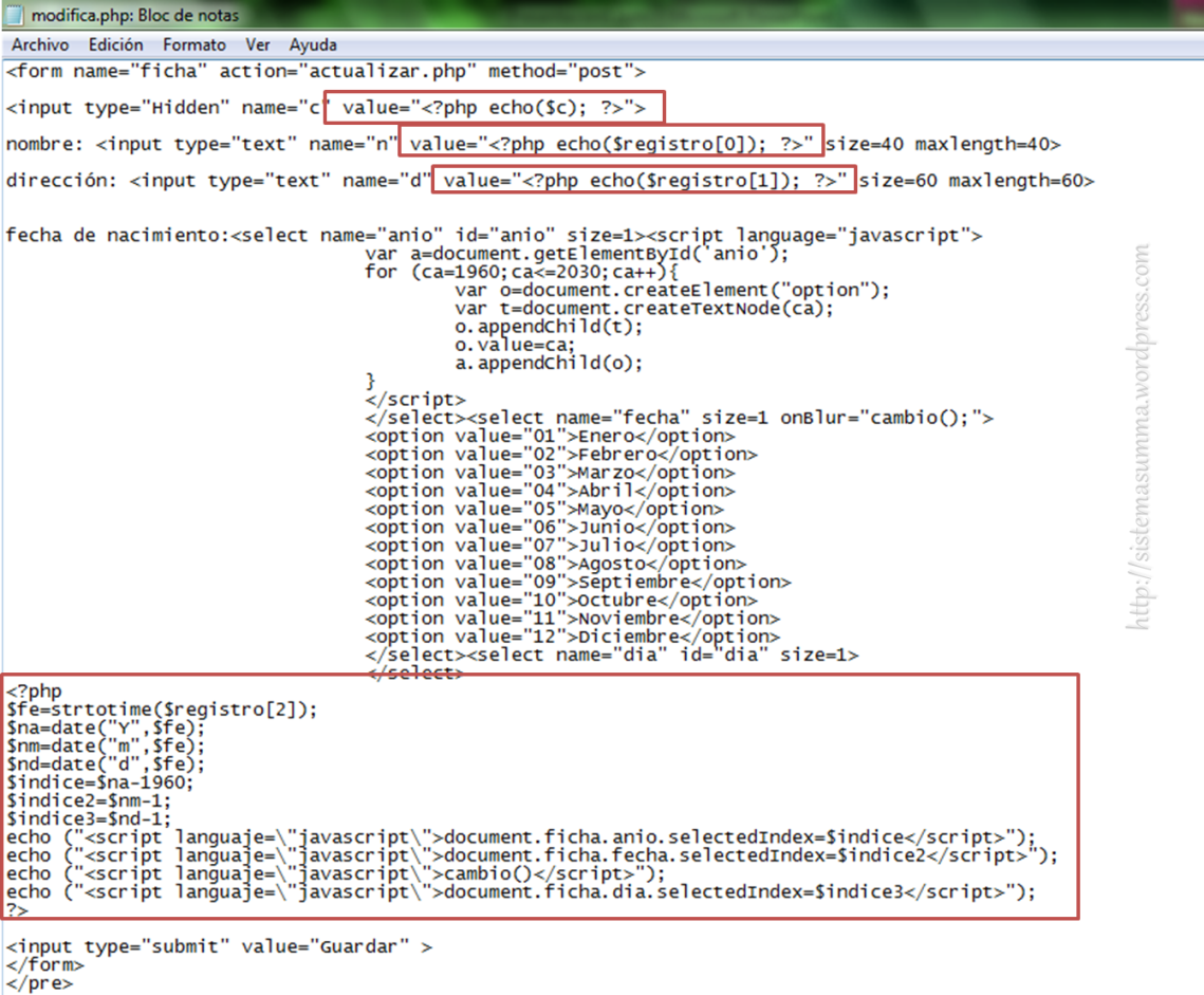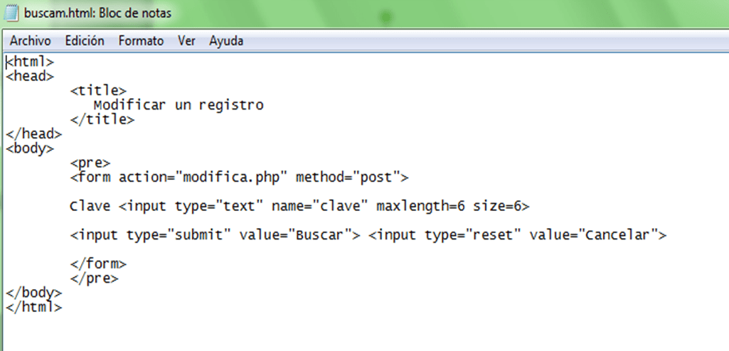 EL navegador tomara el archivo «modifica.php» y lo que no este entre las etiquetas «» será tratado como HTML y javascript respectivamente, así que lo único que debemos hacer es agregar los códigos php necesarios de esta forma obtenemos lo que se denomina un código php embebido en HTML, así que veamos la primera modificación al formulario.