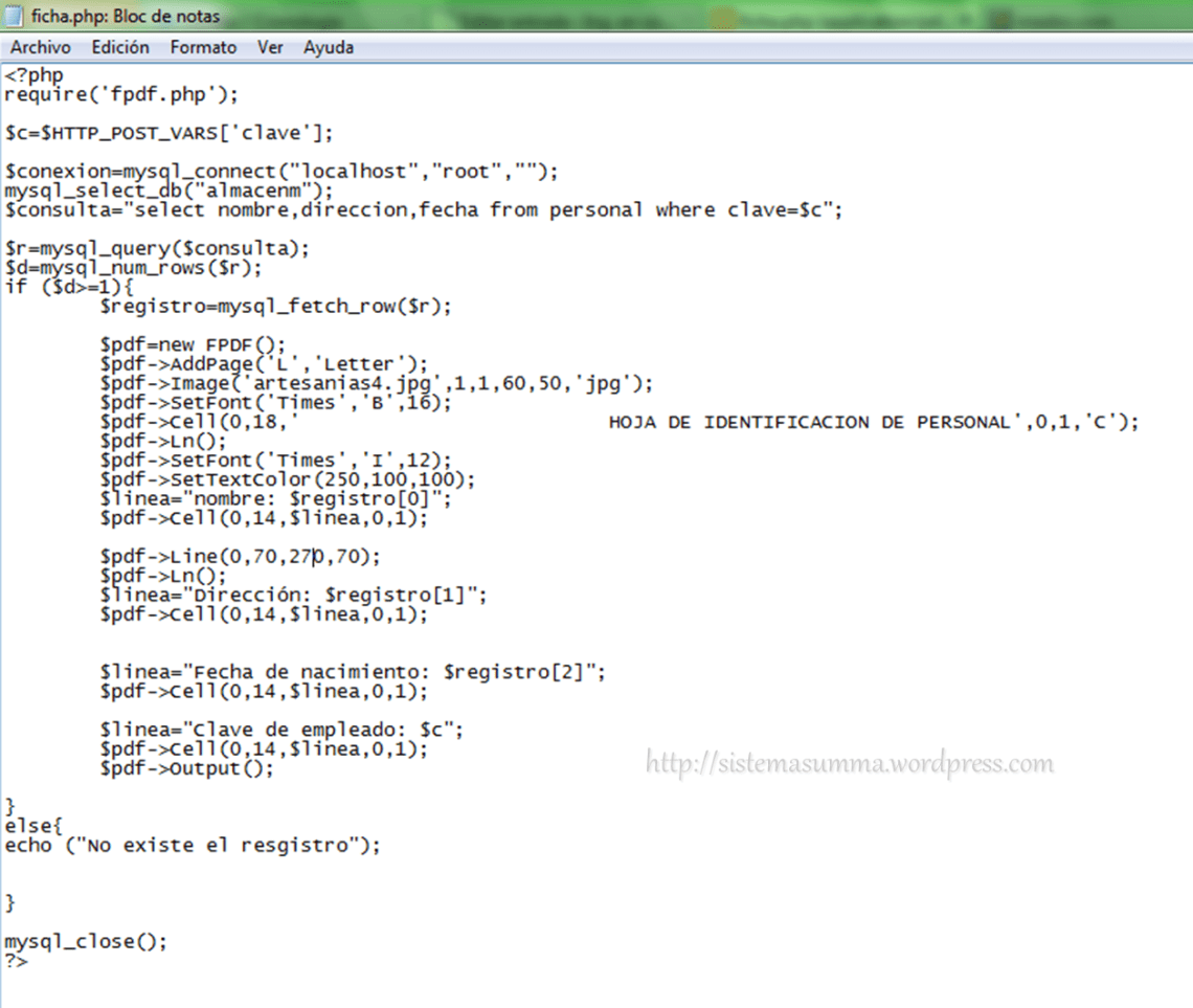 Una vez que se obtiene resultados, se usa mysq_fetch_rows para mandarlo al arreglo $registro y aqui es donde comienza la creación del pdf.