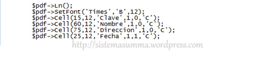 Como puede ver se reduce el tamaño de la letra con «SetFont» y observe que los «cell» que crean el encabezado de la tabla son iguales en sus parámetros, menos el ultimo, recordemos que después del texto entre comillas sigue el indicador de borde que puede ser 1 para que se muestre el borde y 0 sin borde, y después esta el indicador de escritura, el cual ponemos en cero para indicar que la siguiente instrucción cell que se ejecuta continuara desde esa posición y 1 para indicar que se hara un salto de linea.