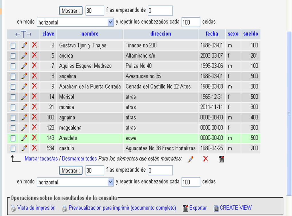 Lo que toca ahora sera la cuestión de elaborar estadísticas y totales a partir de los datos almacenados en la base de datos de mysql, pero para esto necesitare tener campos a través de los cuales pueda hacer cálculos, así que modificaremos la tabla agregando los campos sexo y sueldo, quedando de la siguiente forma: