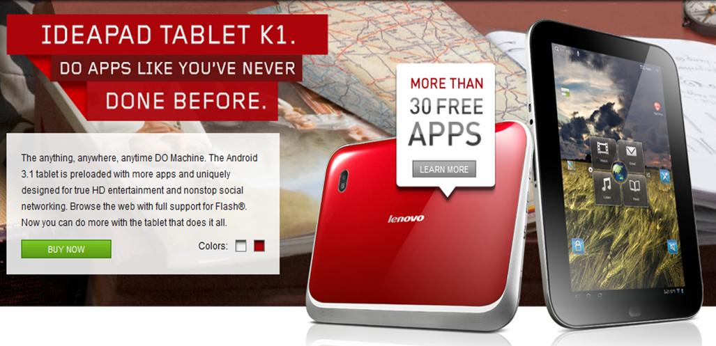 Siguiendo con el mercado de las tablets, tenemos el nuevo lanzamiento de Lenovo, es la tablet IdeaPad K1, que tal y como vemos en la imagen de promoción de la web de Lenovo incluye mas de 30 apps gratuitas.