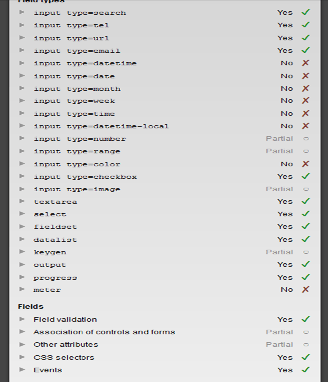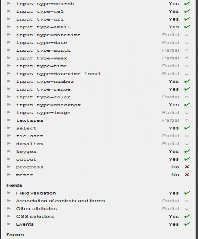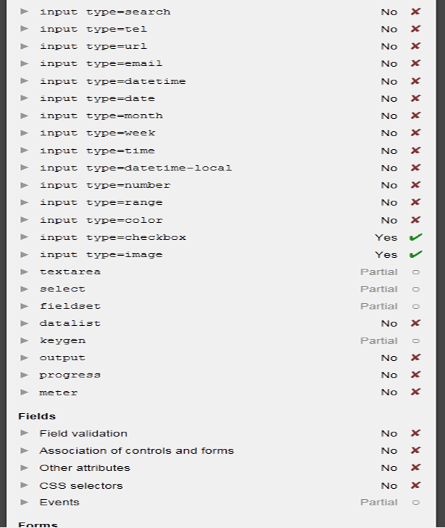 Dado lo anterior y como el post es sobre formularios, comenzaremos con una lista de las compatibilidades de 3 navegadores en cuanto a las etiquetas para formularios en HTML 5