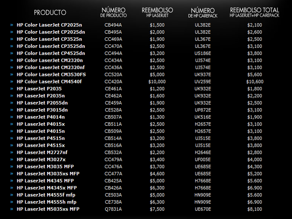 Como podemos ver, debemos comprar una impresora láser, bueno de entrada puede tener sus ventajas, de esta lista el modelo mas económico es una LaserJet P2035 en blanco y negro y si envías tu impresora vieja te reembolsarán $1,200.00 y si le contratas la garantía carepack de HP $1,800.00, resulta bien tomando en cuenta que el modelo en cuestión cuesta unos $4,000.00 aproximadamente.