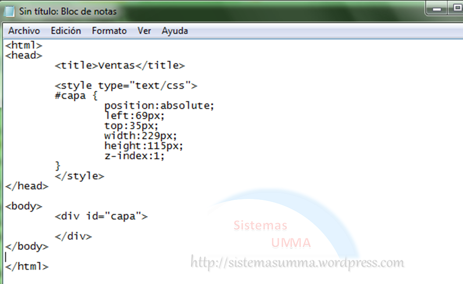 Lo primero para que debemos saber es que las capas se crean con la etiqueta div, tal y como sigue