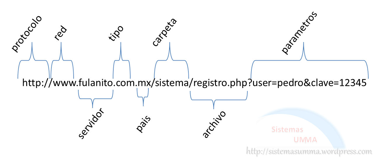 • parámetros: después del ? siguen los pares de variables y valores que estoy enviando al programa o pagina web, cada para de variable=valor se une a la cadena total con un &
