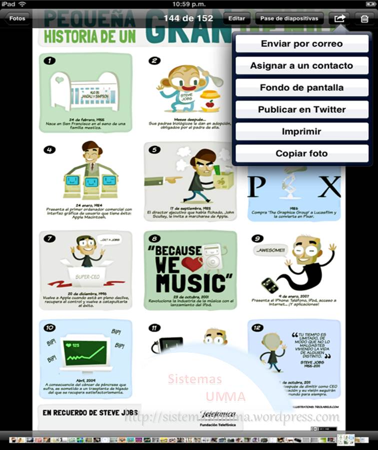 En cuanto a la trinada integración de Twitter con iOS 5, encontramos ahora podemos publicar nuestras fotos, paginas web, entre otras cosas, con dicha red social, ello a través del botón Compartir.
