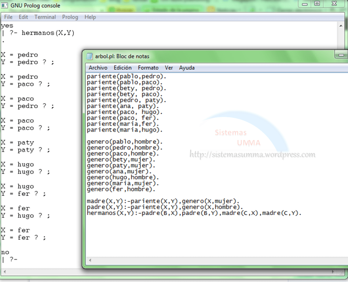 Recordemos que las relaciones solo establecen una dirección, en el caso que nos ocupa pablo es pariente de pedro, pero si enviamos una consulta en el compilador de prolog de la forma pariente(pedro,pablo) obtendremos «no» como respuesta, dado que las relaciones no se crean por defecto en ambas direcciones.