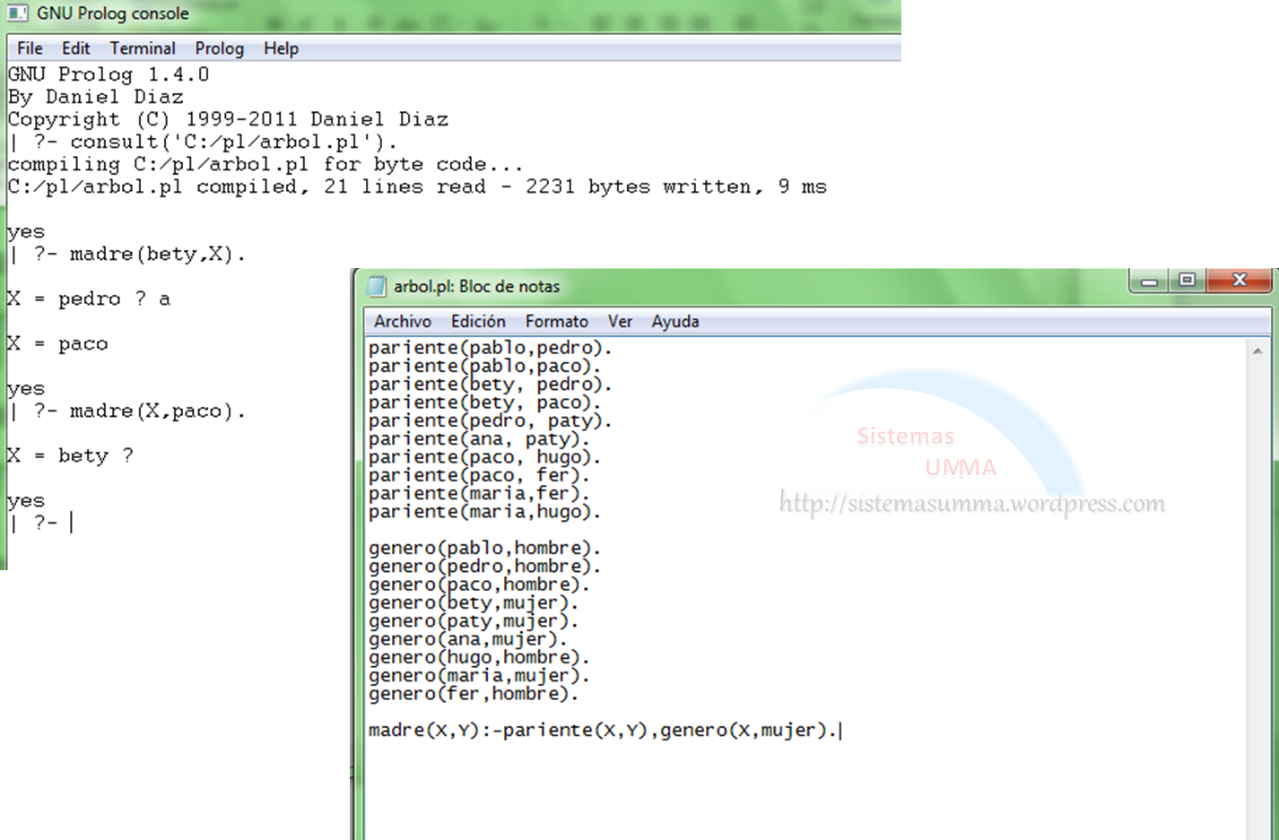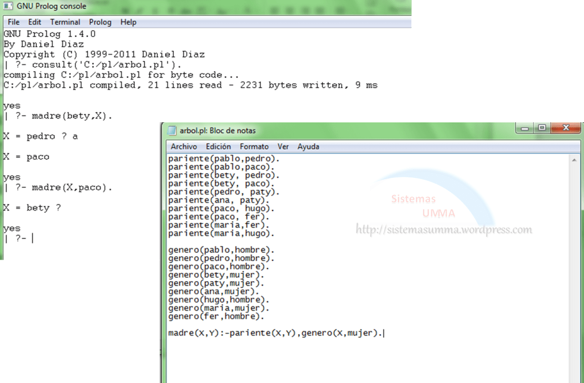 Como puede observase, al fondo hemos hecho la prueba con la función madre, para determinar a través de madre(X, paco), quien es la madre de paco, para ello debemos de observar que nunca se estableció como hecho quien era la madre de paco, solo se estableció como regla que madre serian las personas que fueran parientes de otras y que ademas de ello fueran mujeres, de la misma forma podríamos generar las reglas para padre.