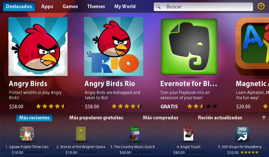 Bien para los fanáticos de los pájaros, tenemos la llegada de ROVIO a la tienda de apps de la Palybook, esta captura es del día de ayer y podemos ver que Rovio llego con su clásico el añorado por muchos Angry Birds, en este caso se trata de las versiones Angry Birds clásico y Angry Bird Rio.