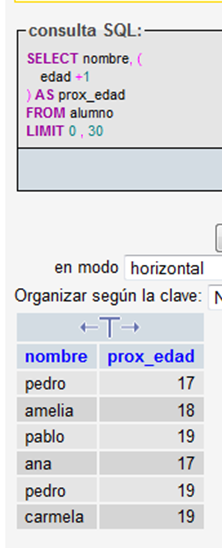 Si antes de hacer la consulta de modificación del ejemplo anterior deseáramos tener una vista previa del resultado podríamos crear un campo llamado prox_edad, a través de la consulta de selección en el que se sumara uno a las edades: