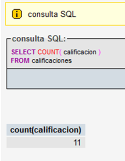 Al indicar en esta consulta que el conteo se hara en base a un campo, no se contaran aquellos registros que tengan un valor NULL en el campo de conteo, es decir, si hay 20 registros en total, pero 9 no tienen calificación el resultado del conteo sera 11. En el caso de usar el símbolo asterisco se cuentan todos los registros independientemente de los valores que contengan.
