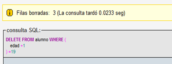 Tomemos esta misma situación para hacer una consulta de eliminación, eliminaremos a los alumnos que al sumar uno a su edad tengan 19 años exactos.