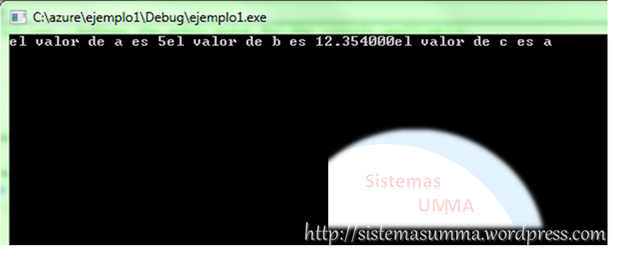 En el ejemplo hemos usado la instrucción printf para presentar en pantalla el valor de cada una de la variables, la sintaxis de esta instrucción es;