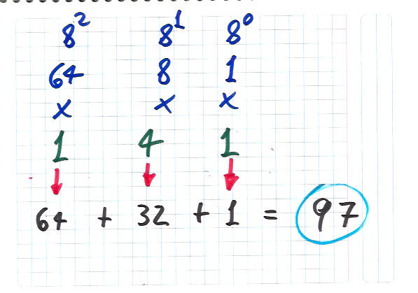 Tal y como lo vemos en la imagen superior el número en octal 141 es el 97 en decimal