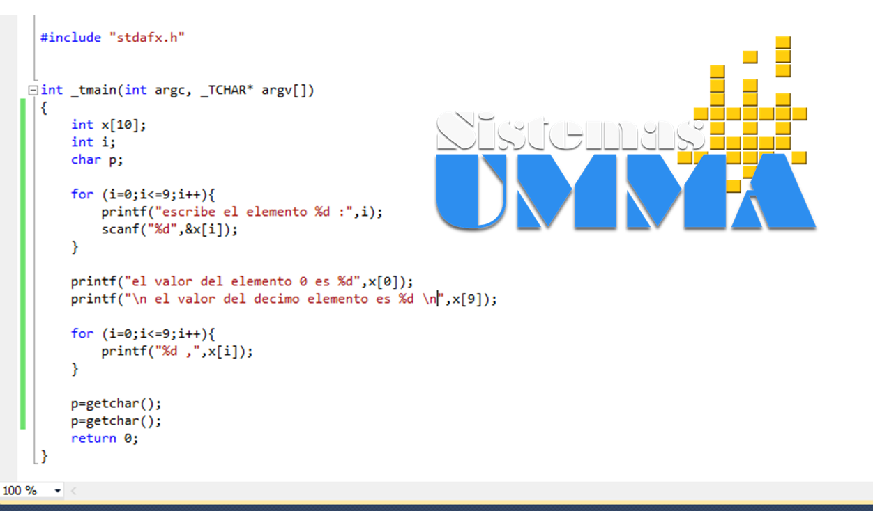 Para terminar el ejemplo podemos ver un ciclo for en el que usamos printf para presentar todos los elementos del arreglo, como se puede observar cualquier operaci{on sobre el arreglo completo o sobre una sección de este, deberá hacerse a través de un ciclo for.
