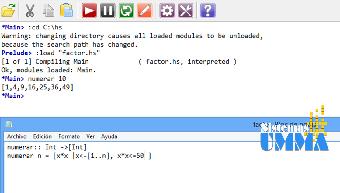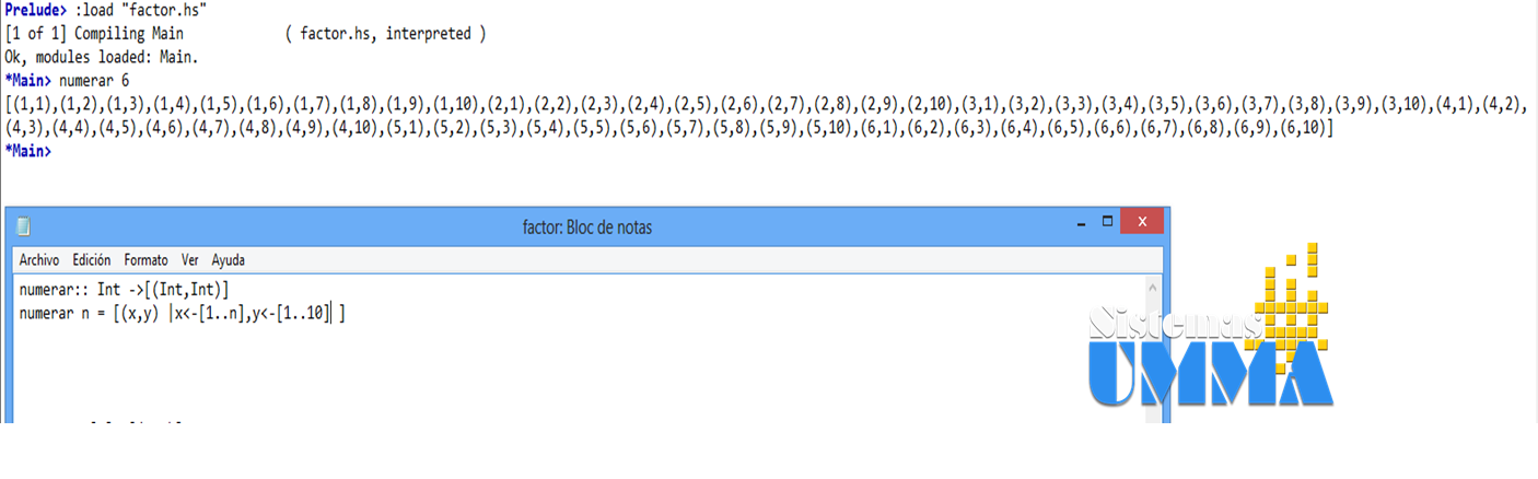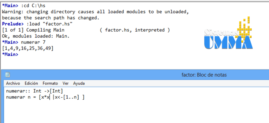 Como podemos observar, hemos creado una función numerar que acepta un valor de tipo entero y devuelve una lista de tipo entero, la función es igual a una lista de X, tal que (|) X toma los valores (<-) de 1 hasta n. En la ejecución de la función, que podemos ver en la parte superior de la imagen, vemos que al darle como parámetro el numero 5, la función genera los valores del 1 al 5.