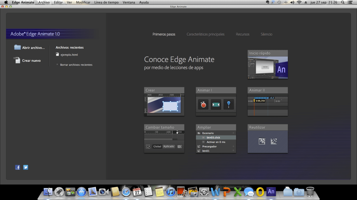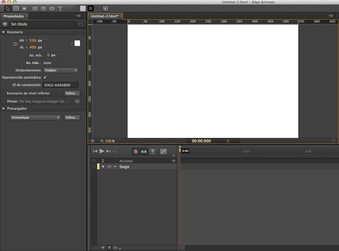 En esta ocasión nos dimos a la tarea de probar Adobe Edge Animator, la cual es una herramienta de diseño de animaciones empleando HTML5, CSS 3 y javascript, así que como diría un amigo es un Flash para HTML5, y en cierto sentido lo es, así que veamos la interfaz principal de este programa.
