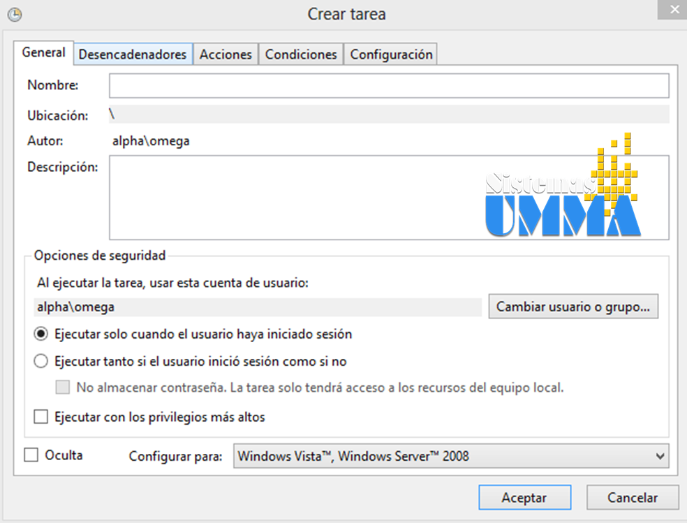 4.- En la pestaña General, le daremos un nombre y una descripción a la tarea.