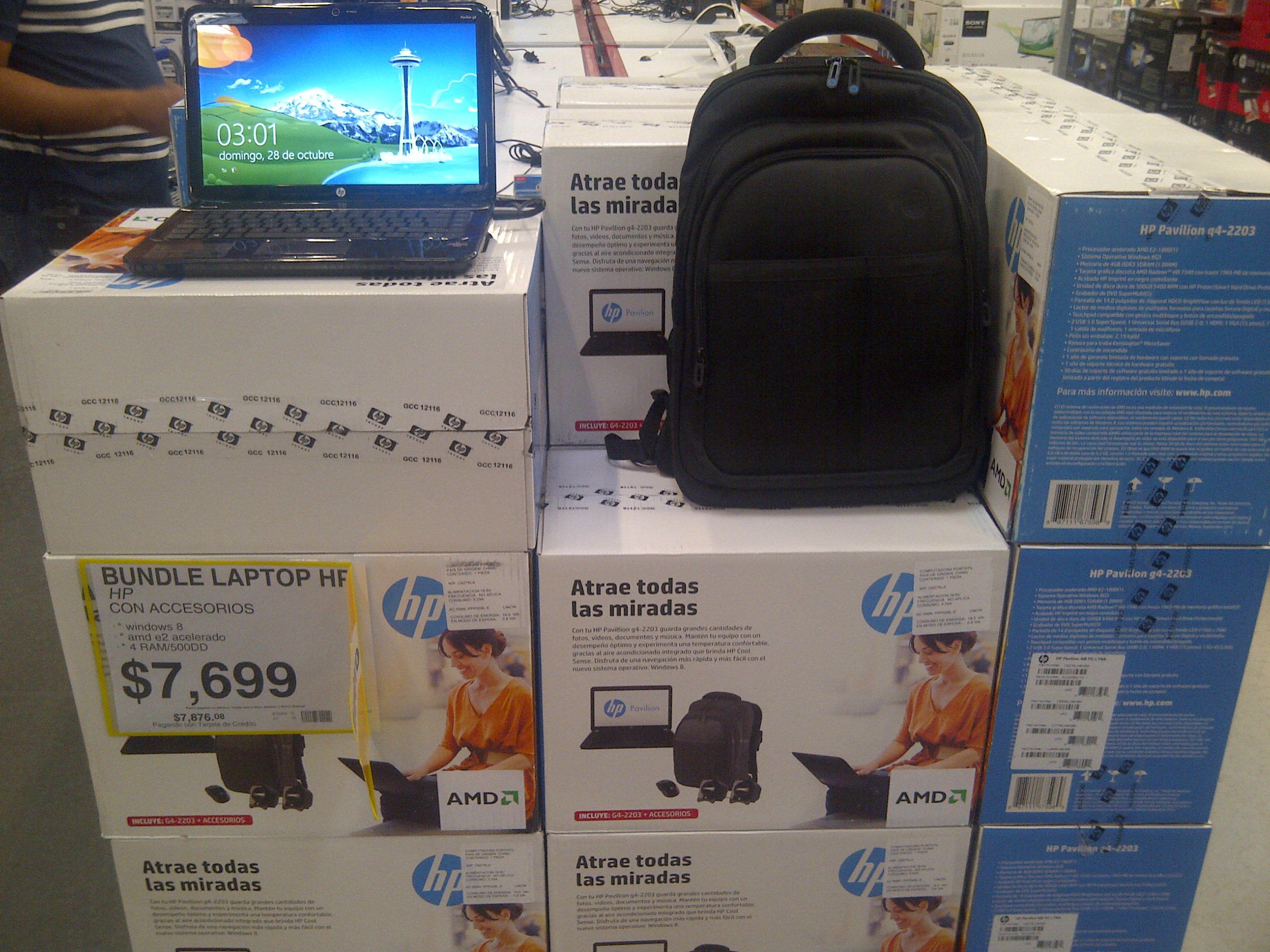 Ya comienzan a hacer su aparición en las tiendas comerciales los primeros equipos con Windows 8 y en esta ocasión nos encontramos con un paquete muy accesible y completo, se trata de la HP Pavillion G4-2203 que incluye por el mismo precio, mochila original HP 1 par de bocinas portátiles y mouse.