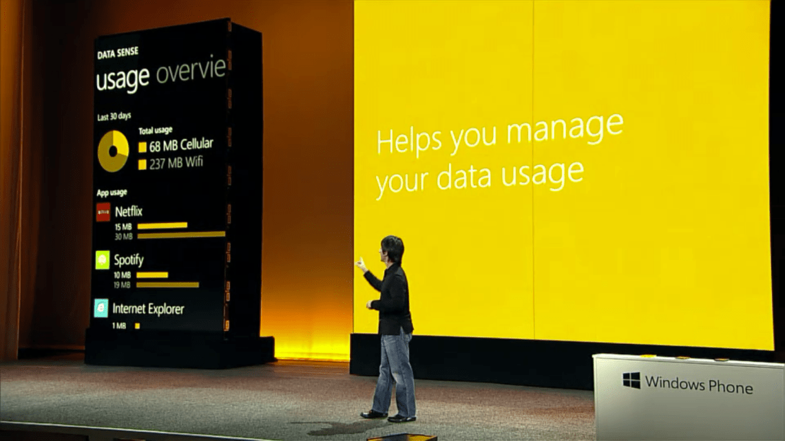 Esta es la característica ideal para el mercado latinoamericano, ya que con Data Sense, no solo podremos controlar nuestro consumo de datos en global, sino que ademas podemos controlarlo por aplicación, pero la característica más importante de todo esto es que incorpora un sistema de compresión de datos, con lo cual nos aseguran podemos tener un 45% mas de navegación con nuestro plan de datos actual, esto al más puro estilo de RIM en sus equipos Blackberry, pero con la diferencia de que esta compresión estará más a cargo de los servidores de la operadora que de los servidores de Microsoft, lo cual causa un retraso en que los usuarios de diferentes operadoras veamos los beneficios, ya que la única que lo ofrece en este momento es Verizon EU.