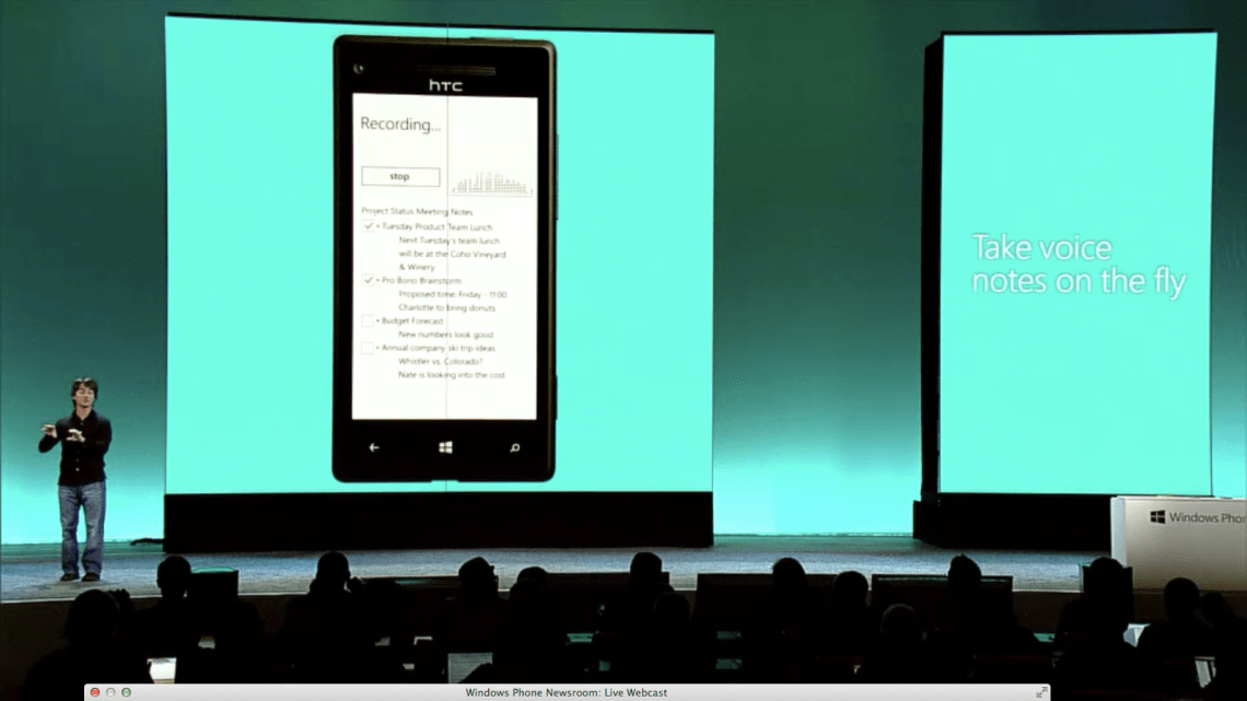 Una característica muy interesante para el mercado profesional, como pueden ser los periodistas, es la toma de notas, con esta función podemos dictarle notas al teléfono, este transcribirá nuestra voz a texto, lo almacenará en un documento y lo subirá de forma automatica a nuestra cuenta de skydrive para que una vez que lleguemos a nuestra casa o centro de trabajo, podamos descargarla en una PC o Mac, o bien modificarla en la nube.