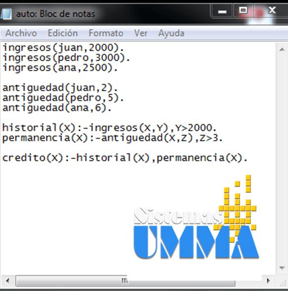 Como cualquier otro lenguaje de programación, PROLOG posee la capacidad de evaluar expresiones lógicas, como ejemplo, tomaremos el caso del programa que esta en la imagen superior, en donde hemos representado las condiciones para la autorización de un crédito.