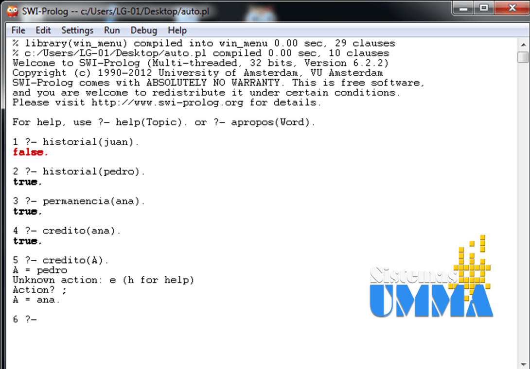 Como podemos observar, al consultar el historial de Juan, obtenemos una respuesta negativa, pues este no cumple con la antigüedad requerida. mientras que Pedro y Ana si la cumplen, ahora bien, al hacer la consulta crédito(A), prolog nos devuelve la lista de las personas que si cumplen con todas las reglas del crédito.