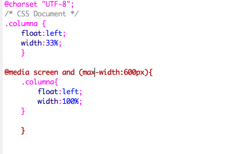 Una parte esencial de el diseño adaptativo son los media query, con las que definimos que un conjunto de reglas CSS se aplicaran en un momento determinado, en este caso el media query que tenemos esta orientado a la pantalla (@media screen) y se activara cuando el ancho máximo de la ventana del navegador sea de 600 pixeles, también podemos detectar la orientación de la pantalla, pero eso será en otro ejemplo, ahora bien, dentro del media query tenemos que la regla que se aplicará será que las etiquetas de la clase columna, ahora ocuparan todo el ancho de la pantalla, por lo que nuestras columnas se convertirán en franjas apiladas de la siguiente forma: