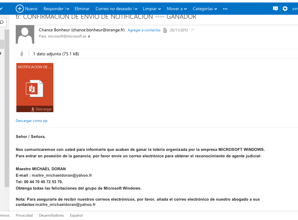 - Los avisos de los sorteos provienen de las direcciones de correo electrónico oficiales de la empresa que lo organiza o del dominio de la pagina web del concurso, por ejemplo, en el caso de la imagen el correo viene del dominio orange.fr que no tiene relación con Microsoft y el supuesto representante da una dirección de correo de yahoo.fr, como podemos ver, los dominios de los correos no corresponden, por lo tanto es falso.