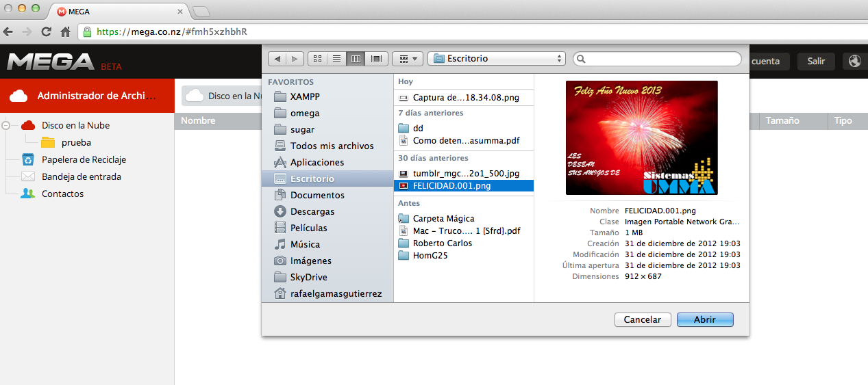 El día de ayer abrió el nuevo servicio de Kim Dotcom y ya para todos es sabido que en sus primeras 14 horas de vida el servicio se vio rebasado por las solicitudes de los miles de usuarios que al igual que nosotros querían ser los primeros en probar, pero el día de hoy el servicio aunque lento ya se muestra mas estable, por lo que ya hemos podido probarlo.
