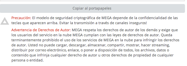Para hacer que el servicio sea legal, cuando obtenemos un enlace obtenemos un mensaje en el que se nos advierte que Mega no es responsable del contenido de los archivos.