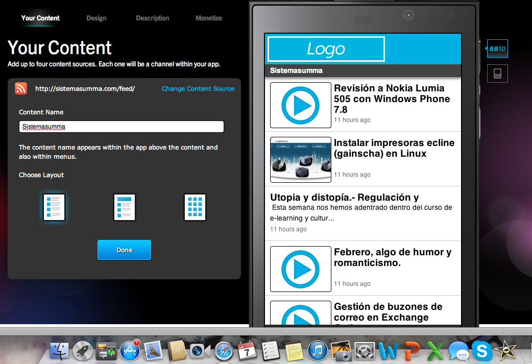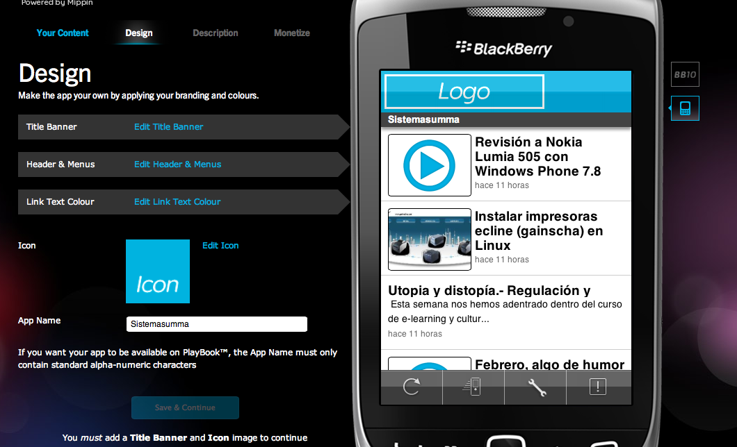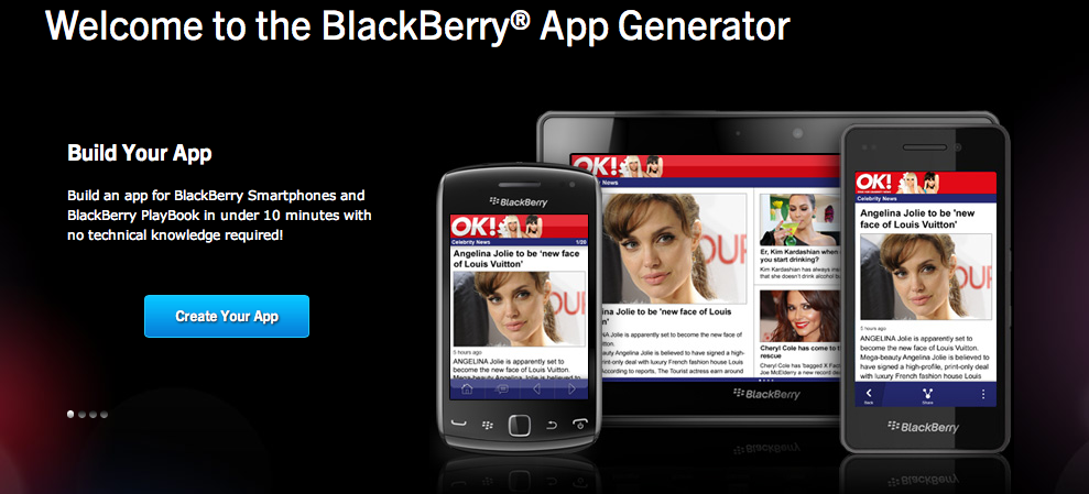 Blackberry había anunciado desde el año pasado el servicio de Blackberry App Generator, un SDK online, a través del cual podremos crear apps para sus smartphones , para la Playbook y recientemente para Blackberry 10, todo esto sin tener que programar, dichas apps están basadas en el consumo de contenido de fuentes de RSS, siempre y cuando contemos con los derechos de publicación de dicho contenido, por lo que nos hemos decidido a probarla creando la app oficial para nuestro blog, así que, veamos el proceso de creación.