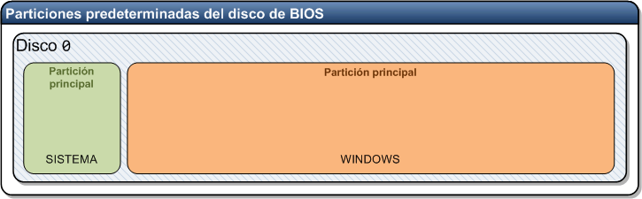 En donde la partición activa (la que se encarga del arranque) es una partición independiente denominada partición de sistema (área verde de la imagen anterior) y el sistema operativo se coloca en la partición principal.