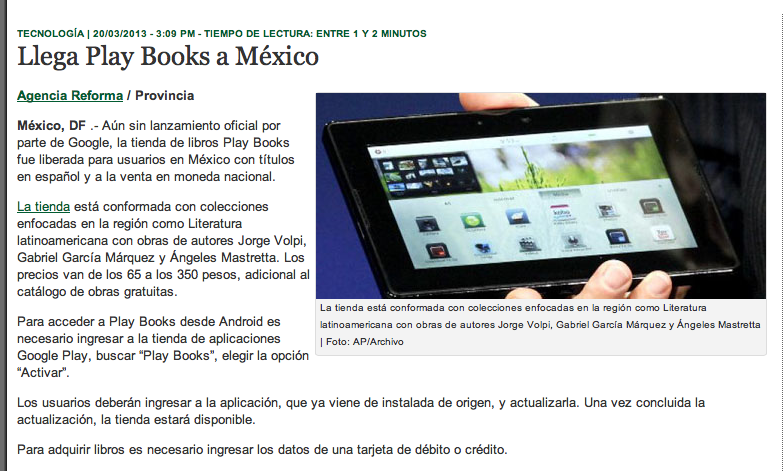 Aunque lo que mas nos llama la atención es la elección del nombre, ya que es un nombre que fácilmente se confunde con el de la tablet de Blackberrry, siendo la Playbook una tablet y Play Books la app de libros de Google, es más hemos encontrado que en la pagina de internet del diario «Provincia» colocaron la imagen de la tablet Playbook en el articulo que habla de la tienda.