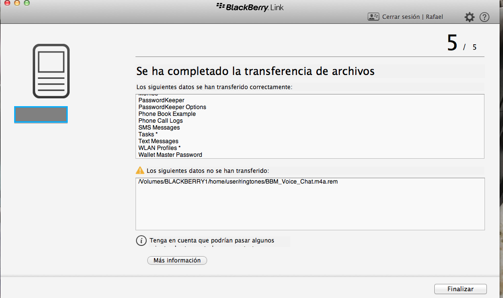 Una vez que termina podremos observar que Blackberry Link a transferido: